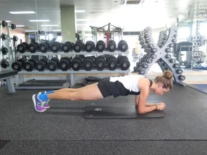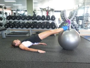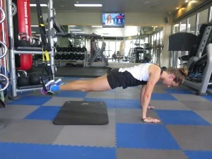 A exercise to challenge your balance and stability, focus on form by maintaining straight body lines, adjusting intensity by how big you make the movement. This can be performed on the Swiss ball too.